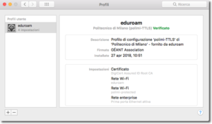 Il profilo contiene la configurazione di due reti wi-fi (“eduroam” e “polimi-protected”) e dell’accesso avanzato wired.